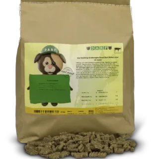 DARF-Vol Rund is compleet droogvoer voor je hond. Afkomstig uit onze eigen slagerij. DARF-Vol Rund zijn natuurlijke hondenbrokken: een verantwoorde en makkelijke vervanger voor vers vlees. Onze hondenbrokken van rund zijn glutenvrij en bestaan voor 60% uit vers vlees.