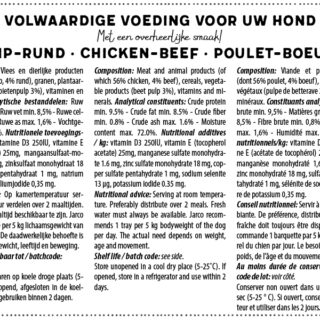 Jarco vleeskuipjes bevatten een premium paté, geschikt als complete dagvoeding. Op kamertemperatuur serveren. Bij voorkeur verdelen over 2 maaltijden. Vers water dient altijd beschikbaar te zijn. Jarco adviseert 1 kuipje per 5 kg lichaamsgewicht van de hond per dag. De daadwerkelijke behoefte is afhankelijk van gewicht, leeftijd en beweging.