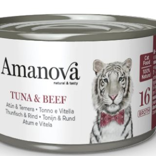 Hier is een traktatie voor jouw kattenvriend met twee favoriete smaken in één blikje. Ons 100% natuurlijke recept zit boordevol verse skipjack tonijn en rund van de hoogste kwaliteit, allemaal in een heerlijke bouillon. Als aanvullende kattenvoeding is deze lekkernij perfect geschikt als tussendoortje, dat af en toe gegeven kan worden naast de reguliere Amanova droogvoeding. Op deze manier creëer je een gezond en uitgebalanceerd dieet. Tonijn zit vol goeds, met natuurlijke taurine dat goed is voor het hart en de ogen van jouw kat en omega-3 vetzuren die wonderen doen voor huid en vacht. Gezond, voedzaam en onweerstaanbaar lekker – wat wil je kat nog meer?